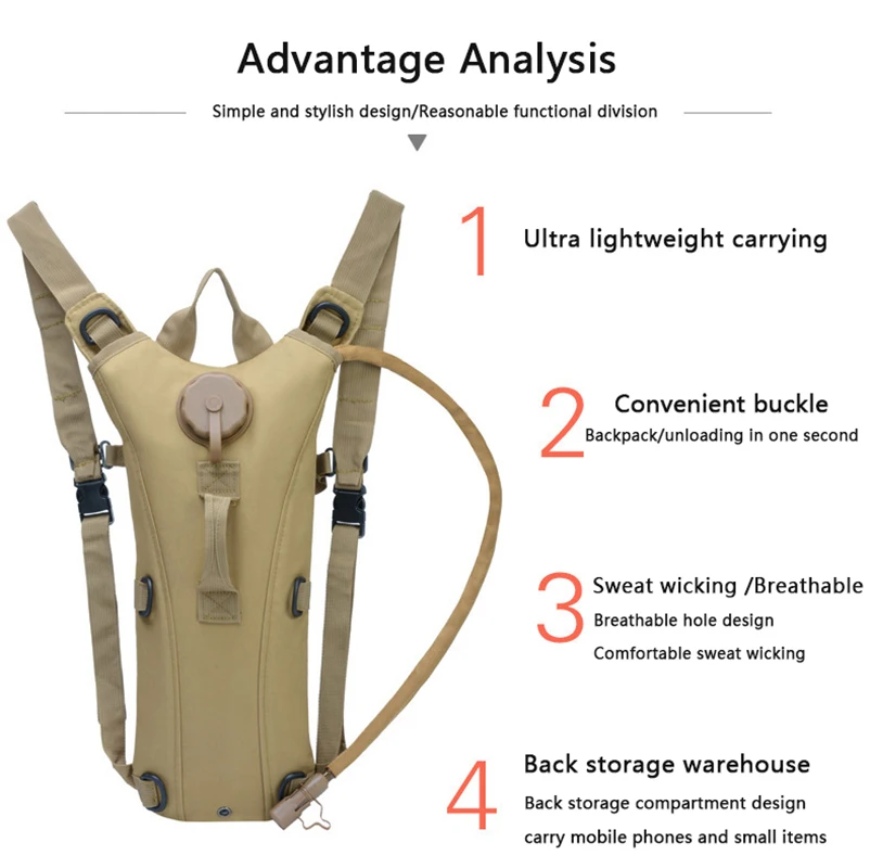 This camping hydration water pack is designed to keep you refreshed during outdoor adventures. With a 3L bladder, it provides ample water storage for long activities. Made from waterproof nylon, it is both durable and lightweight. The design ensures comfortable carrying for running, cycling, or hiking. A secure hose system makes it easy to drink on the go. Perfect for camping, climbing, or long-distance tourism, it supports active lifestyles. The pack distributes weight evenly to reduce strain. Its compact design allows easy storage when not in use. Built to withstand rugged outdoor conditions, it is a reliable hydration companion. This water pack is essential for staying hydrated during sports and outdoor exploration.