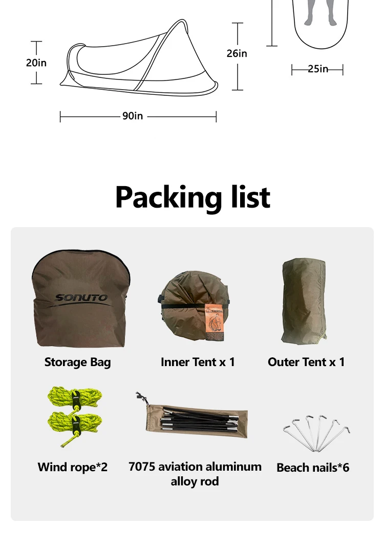 Sonuto Camp Bed Tent – Waterproof Sunshade Single Camping Tent, Lightweight 210D Oxford, Aluminum Poles, Windproof & Portable